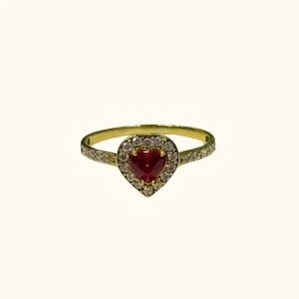 Este elegante anillo medio cintillo presenta un hermoso rubí (piedra semipreciosa) en forma de corazón como piedra central, acompañado de circones laterales que aportan luz y equilibrio.