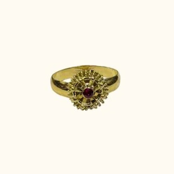 Este exclusivo anillo chevalier, hecho completamente a mano en oro 18K, presenta un diseño único tipo nido con trabajo artesanal calado que protege un rubí (piedra semipreciosa) rojo central. Simboliza protección, hogar y lo valioso que guardamos cerca del corazón.