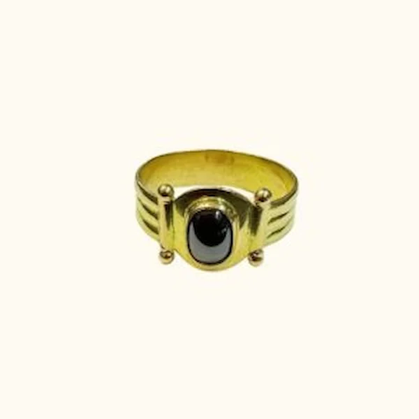 Este histórico anillo romano dama, hecho completamente a mano en oro 18K, presenta un ónix (piedra semipreciosa) negro profundo enmarcado en un diseño tipo pergamino que evoca historia, cultura y sabiduría antigua. Una joya que combina arte histórico con elegancia femenina.