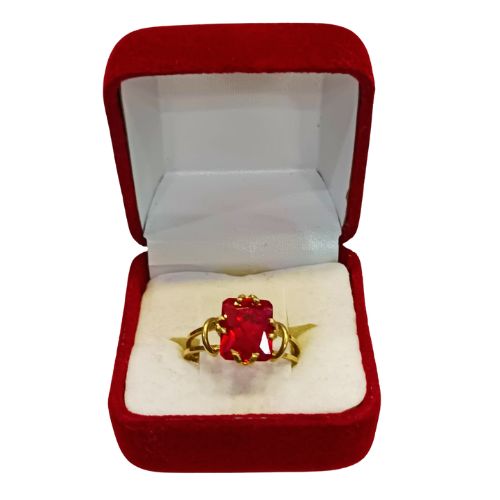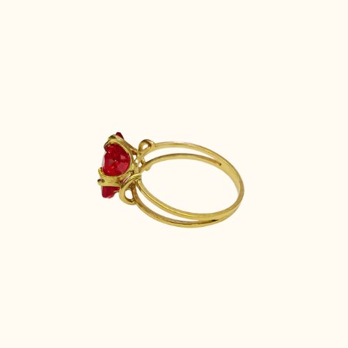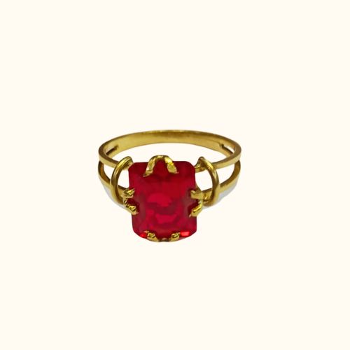 Este moderno anillo tipo solitario, hecho completamente a mano en oro 18K, presenta un rubí (piedra semipreciosa) rectangular en formato que combina la elegancia clásica del solitario con un toque de modernidad. El color rojo intenso del rubí simboliza pasión y amor verdadero.