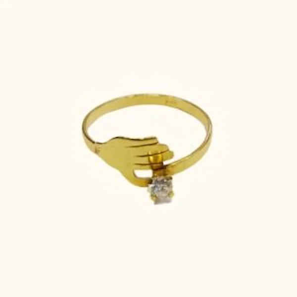 Este tierno anillo juvenil, hecho completamente a mano en oro 18K, presenta un hermoso diseño solitario donde dos delicadas manitas sostienen un circón brillante. Simboliza el cuidado, la protección y el valor de lo que guardamos cerca del corazón.