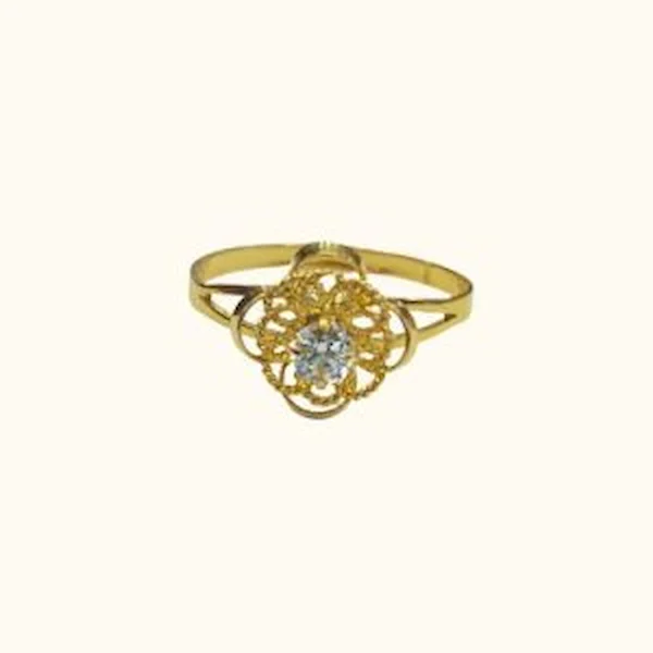 Este hermoso anillo juvenil, hecho completamente a mano en oro 18K, combina una delicada rosa con circón brillante central en un aro trenzado artesanalmente. Representa la belleza natural tejida con arte y dedicación, perfecta para jóvenes que valoran el trabajo artesanal.
