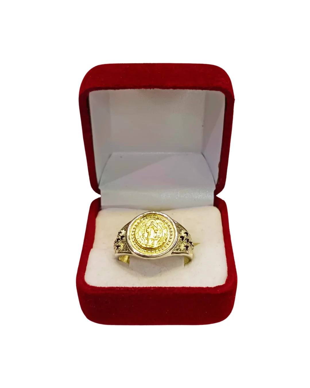 Imponente anillo tipo sello en plata 925 con medalla San Benito al centro y piedras ónix negras en los laterales, símbolo de protección divina, fe profunda y elegancia espiritual. Las piedras ónix añaden un toque de distinción y contraste perfecto con la plata, ideal para hombres devotos que buscan una joya con significado religioso y presencia.