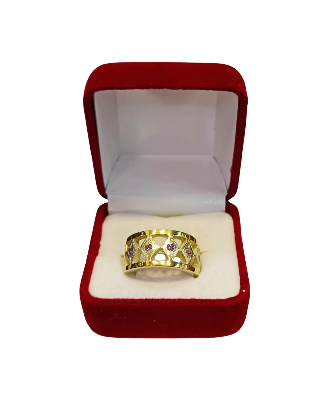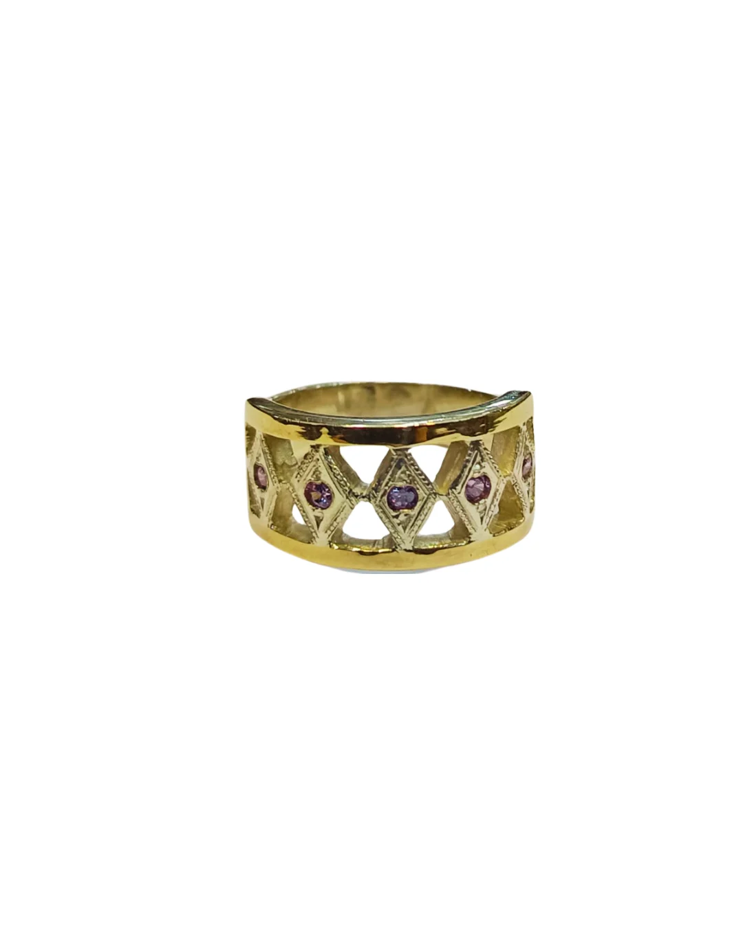 Elegante anillo juvenil tipo romano en plata 925 con diseño rombo y detalles en oro, símbolo de solidez, precisión y estilo contemporáneo. Su banda ancha con lkos rombos al centro combina fuerza y elegancia, perfecta para quienes buscan una joya con presencia y estilo moderno.