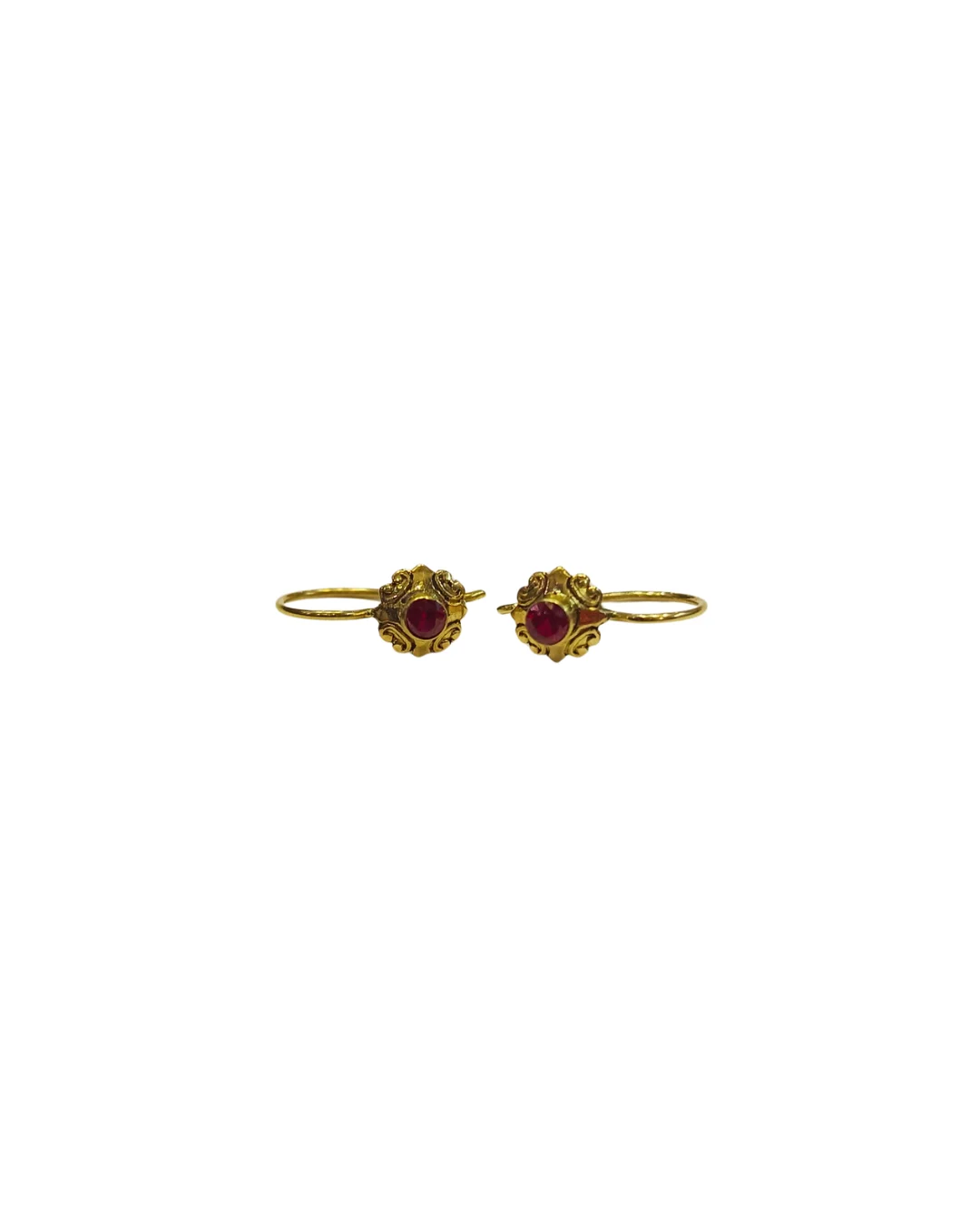 Estos delicados aros colgantes, hechos completamente a mano en oro 18K, presentan diseño de rosita con piedra semipreciosa central que cuelga con gracia floral. La rosita simboliza belleza delicada y amor que florece.