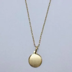 Delicada cadena limada de 45 centímetros en oro 18K con un colgante disco recordatorio número 1, perfecto para grabar nombres, fechas o mensajes especiales que quieras llevar siempre cerca de tu corazón.