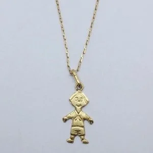 Delicada cadena limada de 45 centímetros en oro 18K con un tierno colgante niño, símbolo de bendición, alegría y amor familiar. Perfecta para celebrar la llegada de un nuevo bebé varón, regalar en bautizos o para mamás que quieren llevar siempre cerca el símbolo de su hijo.