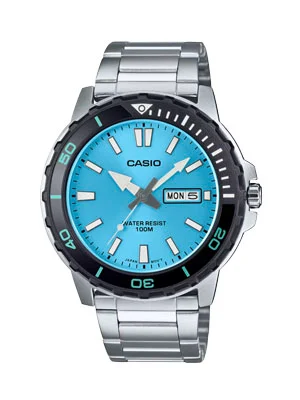 ⌚ Reloj analógico Casio de colección para hombre en acero inoxidable con esfera celeste turquesa y bisel negro. Diseño inspirado en relojes de buceo con resistencia al agua de 100M, perfecto para quienes buscan un reloj robusto, moderno y con carácter propio.
