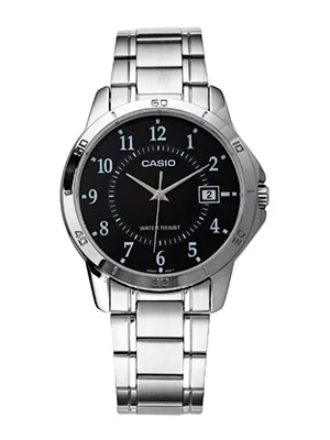 Reloj analógico Casio en acero inoxidable con elegante esfera negra, diseño clásico perfecto para uso diario, oficina y ocasiones formales. La combinación de acero plateado y esfera negra aporta sobriedad y distinción, ideal para quien busca un reloj elegante y versátil.